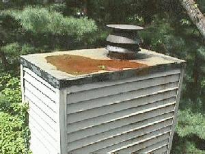 | This is a rusted chase cover on a manufactured fireplace, also known as a pre-fab fireplace. When this eventually occurs it will let water drip in through small pinholes, causing more damage to the fireplace unit. This chase top should be replaced. |
