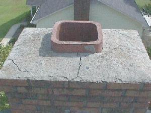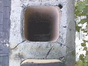 | Top view of the same chimney. Note the mortar around the recessed flue tile. It actually encourages water to enter the flue. The flue tile should extend at least two inches above the chimney crown and should have a rain cap covering the flue. |